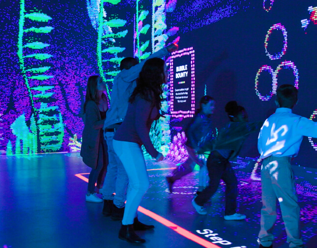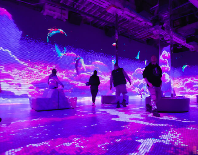 Visitors then step into a larger room, where the walls are lined with large, segmented panels, each serving as a dynamic screen that hosts the vivid, pixelated animations integral to the experience.